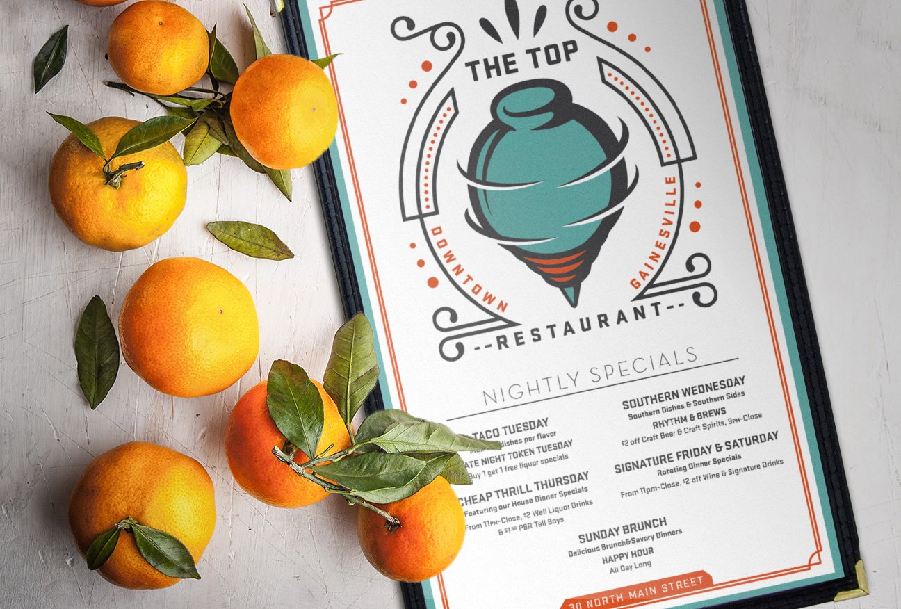 The Top, a beloved Gainesville institution, approached me for a comprehensive brand refresh that would modernize their identity while preserving the character that has made them a staple of the local dining scene. With a reputation for eclectic charm, craft cocktails, and a welcoming atmosphere, The Top needed a brand evolution that felt fresh yet familiar.